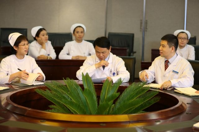 中国医学科学院肿瘤医院徐兵河教授(右三)、马飞教授(右四)携治疗团队在病房查问病人康复情况。