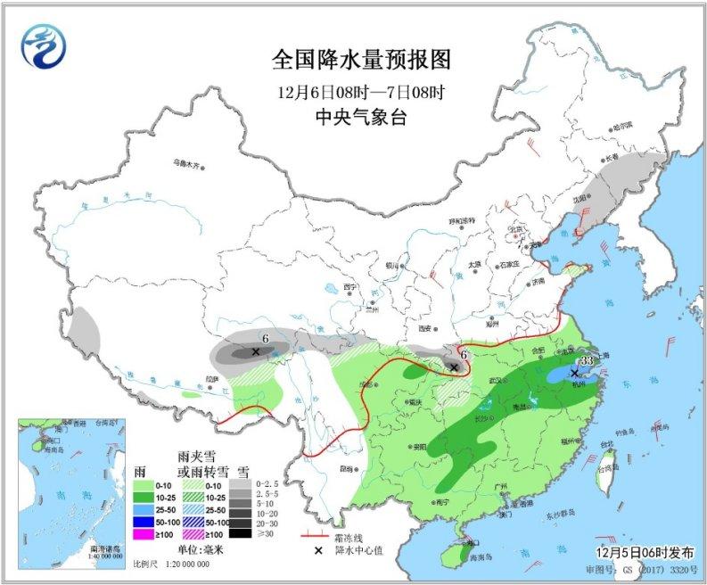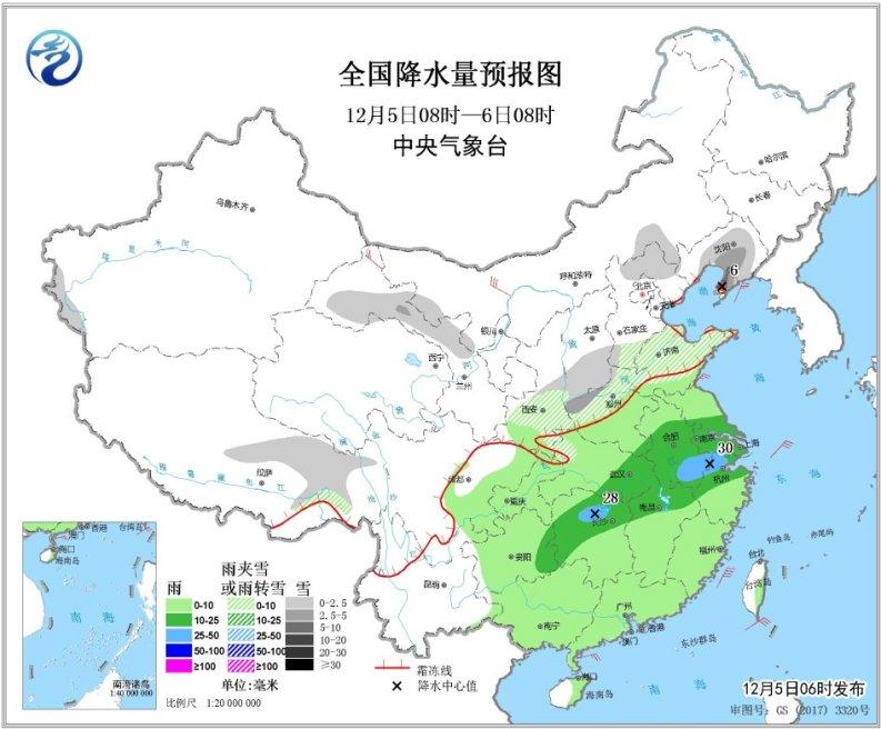 12月5日08时至6日08时,西藏东部、甘肃西部、陕西南部、山西南部、河南北部、河北南部和北部、辽宁中南部和山东中北部等地有小到中雪或雨夹雪,其中辽宁南部局地有大雪(5~6毫米)。黄淮南部、江淮、江汉、江南、华南、西南地区东部等地有小到中雨,其中,湖南北部和安徽南部等地局地有大雨(25~30毫米)。内蒙古西部等地有4~6级风,渤海、东海、南海东北部海域将有6~7级风,阵风8级(见图3)。