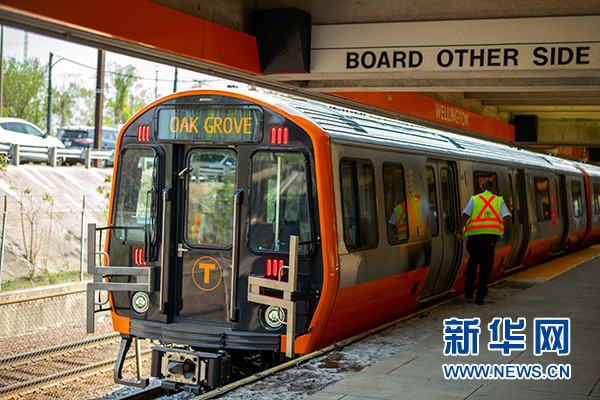 2018年5月15日在美国马萨诸塞州梅德福德惠灵顿站拍摄的中车长客为波士顿橙线地铁“量身订制”的首批车辆。新华社记者 李木子 摄