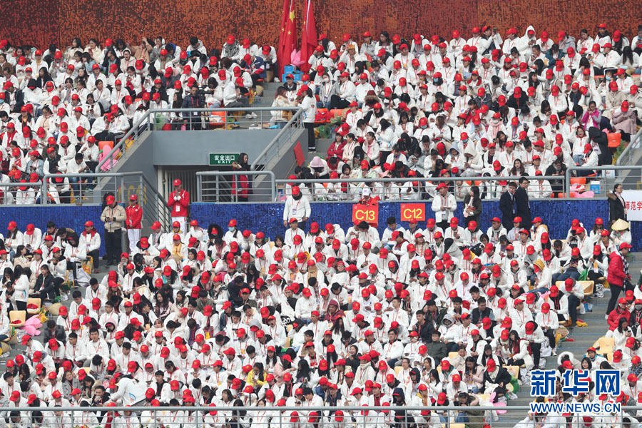 12月10日下午,广西壮族自治区成立60周年庆祝大会将在广西体育中心隆重举行。图为现场观众。新华网 陈杰 摄