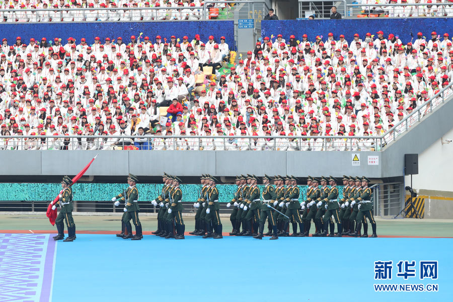 12月10日下午,广西壮族自治区成立60周年庆祝大会将在广西体育中心隆重举行。图为国旗护卫队入场。新华网 陈杰 摄