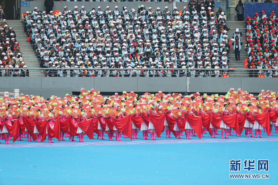 12月10日,广西壮族自治区成立60周年庆祝大会在广西体育中心隆重举行。图为文艺表演序曲《花海迎宾朋》。新华网 陈杰 摄
