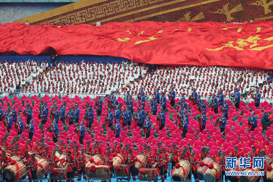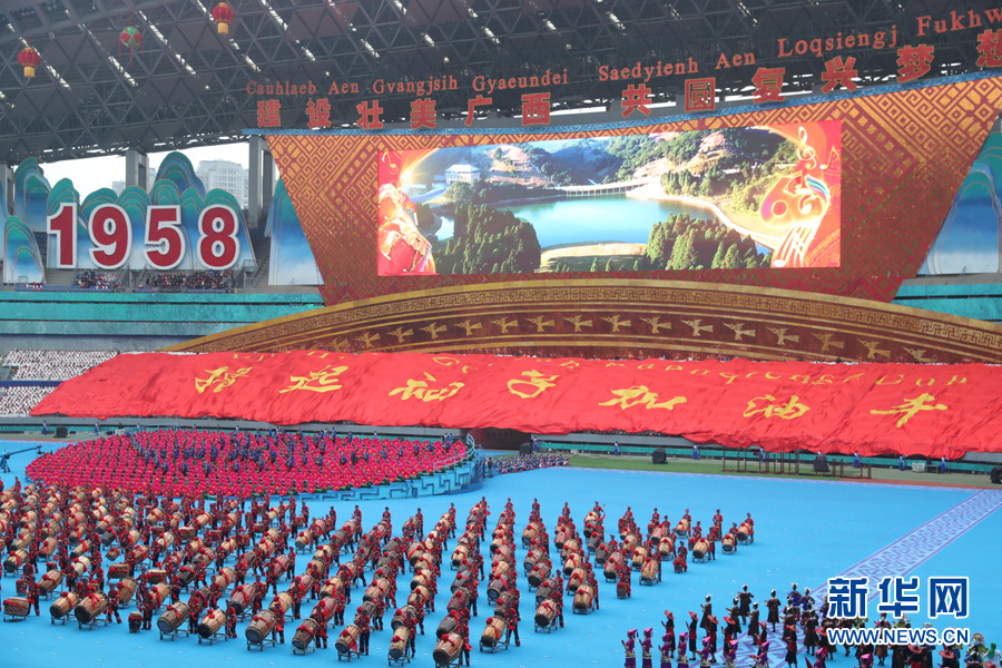 12月10日,广西壮族自治区成立60周年庆祝大会在广西体育中心隆重举行。图为文艺表演《千年会鼓擂》。新华网 陈杰 摄