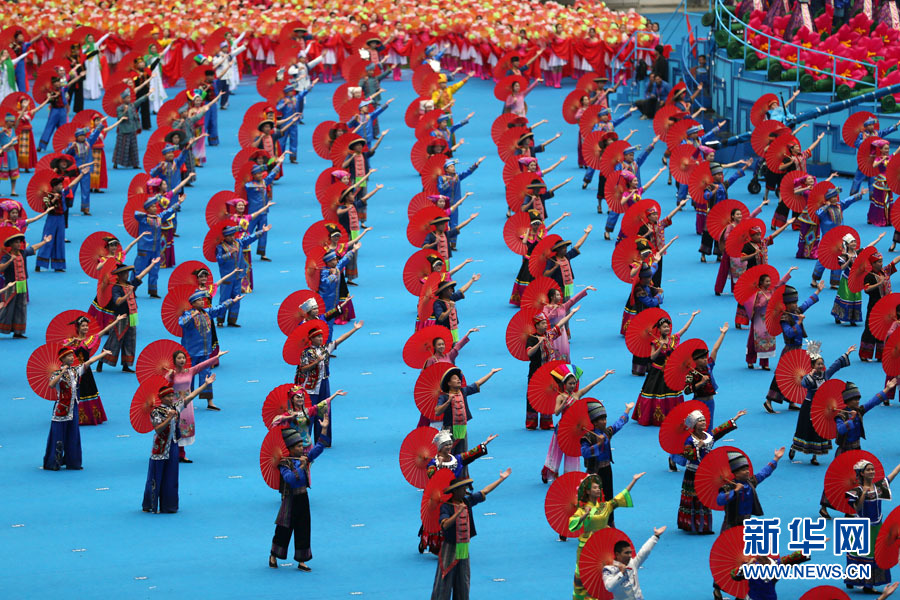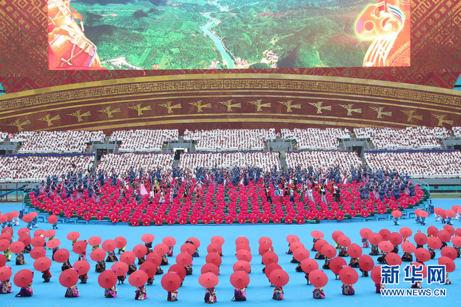 12月10日,广西壮族自治区成立60周年庆祝大会在广西体育中心隆重举行。图为文艺表演《歌海春潮涌》。新华网 陈杰 摄