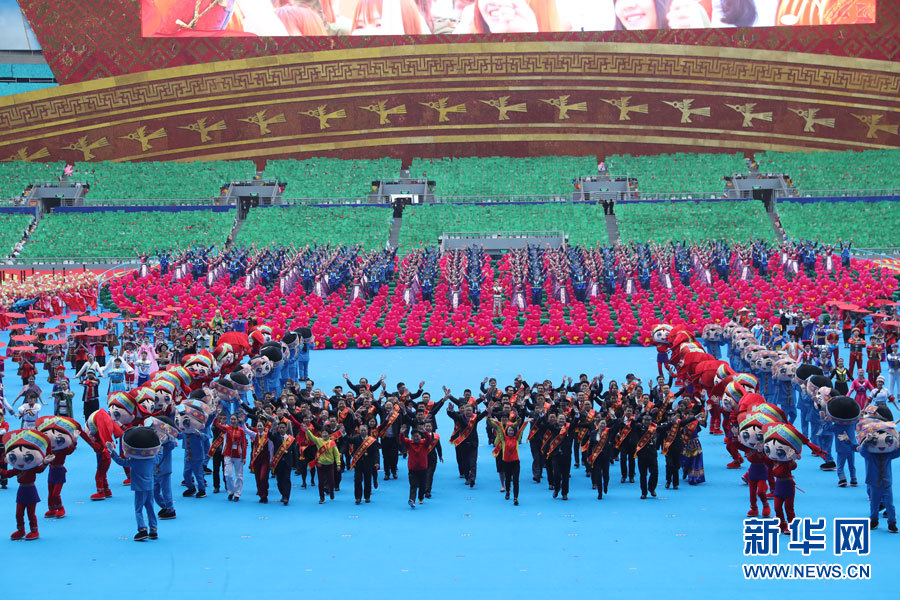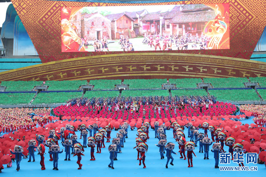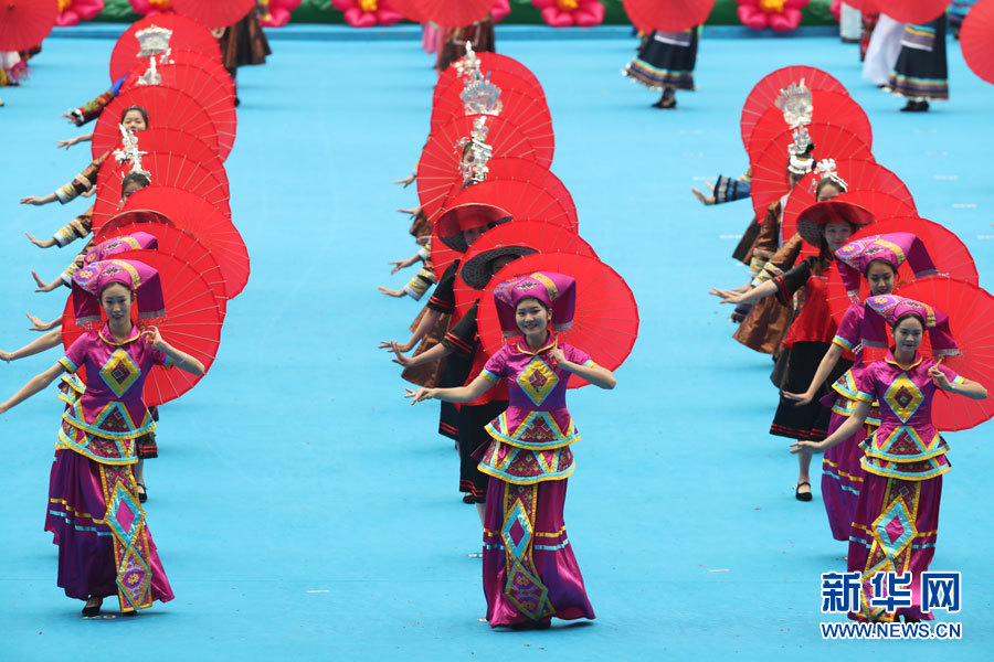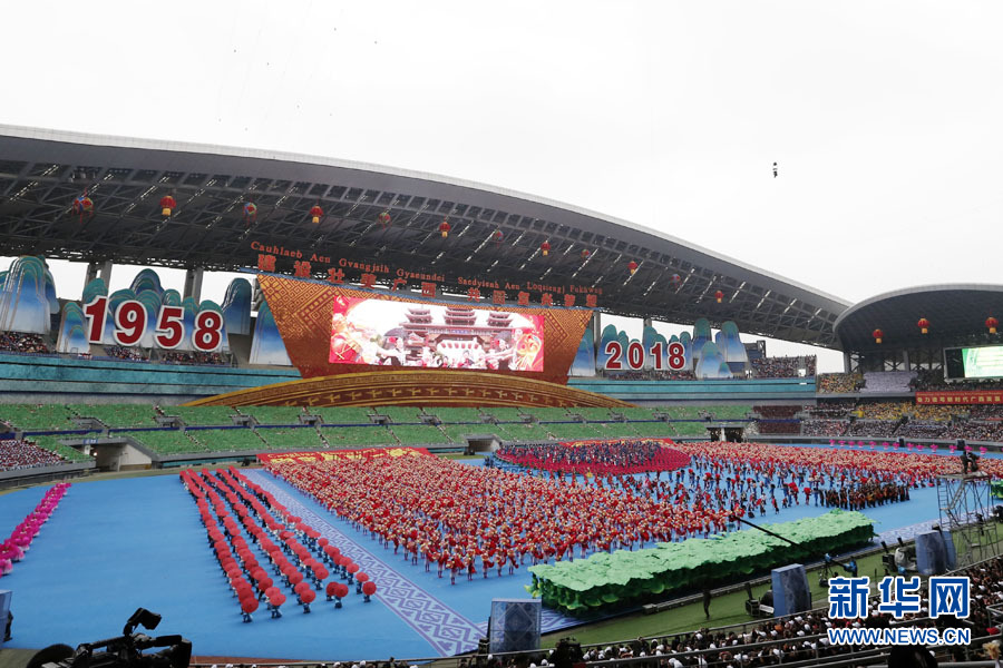 12月10日,广西壮族自治区成立60周年庆祝大会在广西体育中心隆重举行。图为文艺表表演《广西尼的呀》。新华网 陈杰 摄