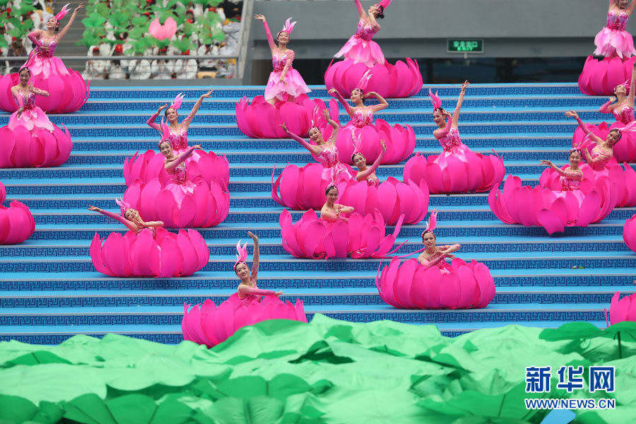 12月10日,广西壮族自治区成立60周年庆祝大会在广西体育中心隆重举行。图为文艺表演《习习清风荷花舞》。新华网 陈杰 摄