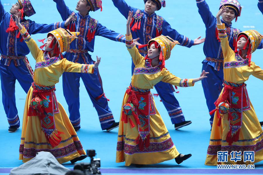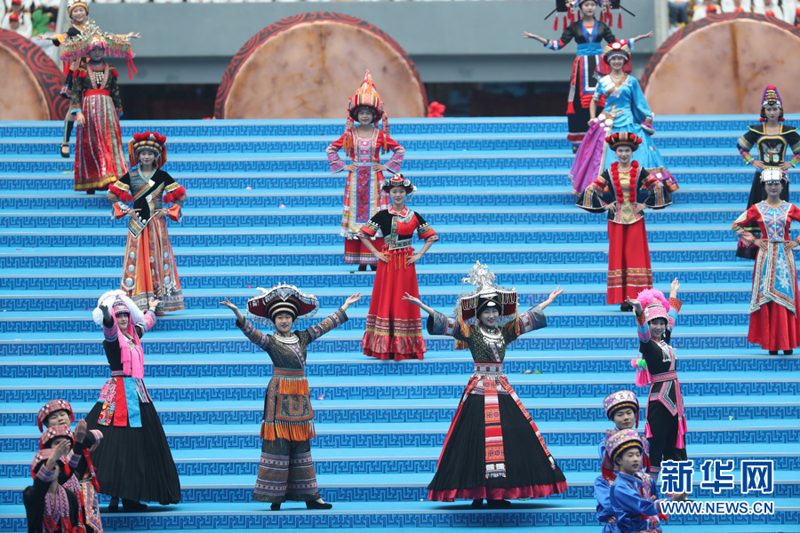 12月10日,广西壮族自治区成立60周年庆祝大会在广西体育中心隆重举行。图为文艺表演《瑶族服饰·绽放》。新华网 陈杰 摄