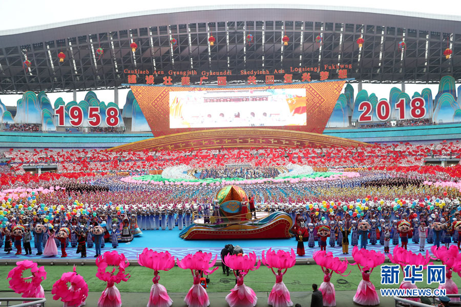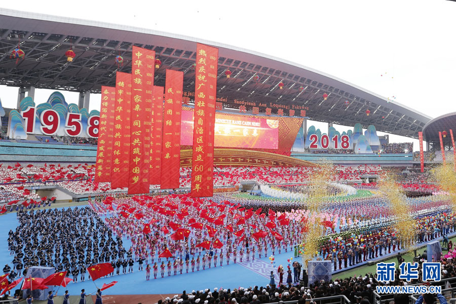 12月10日,广西壮族自治区成立60周年庆祝大会在广西体育中心隆重举行。图为文艺表演《奋进吧,新时代》。新华网 陈杰 摄