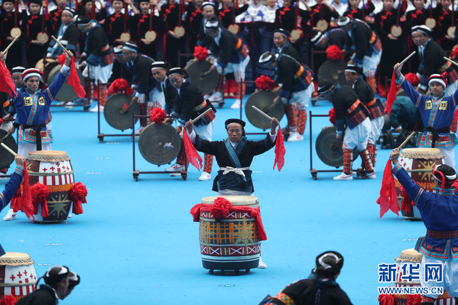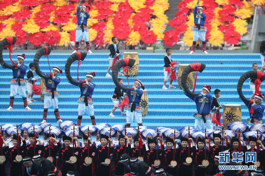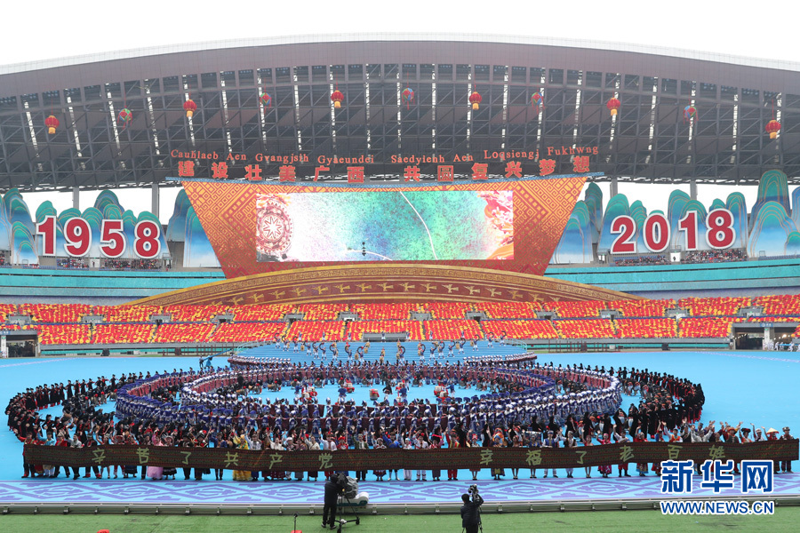 12月10日,广西壮族自治区成立60周年庆祝大会在广西体育中心隆重举行。图为文艺表演《铜鼓敲响幸福天》。新华网 陈杰 摄
