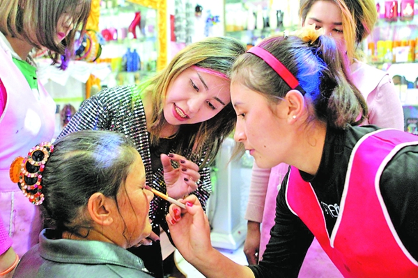 11月26日晚,喀什地区叶城县吐古其乡经营美容美发连锁店的祖丽胡玛尔·艾木都拉(中)正在教村民美容方法。