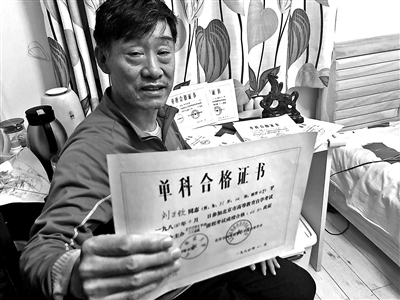 ▲刘正钦展示在1984年获得的高等教育自学考试单科合格证书