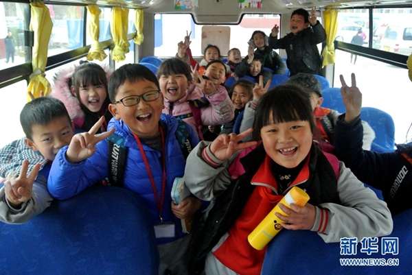照金北梁红军小学学生在校车上合影(12月4日摄)。 新华社记者 梁爱平 摄
