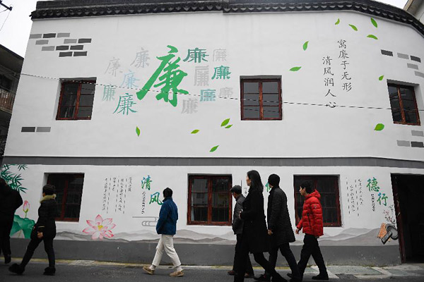 12月19日,居民从浙江省湖州市吴兴区飞英街道一面以“清廉”为主题的墙绘前走过。近年来,吴兴区飞英街道办事处依托社区文明楼道等阵地,以图文并茂的形式,将历代名人廉洁治家故事、家风家训等内容绘上墙壁,逐渐将周边打造成以“清廉”为主题的街区,成为弘扬社会良好风尚的风景线。