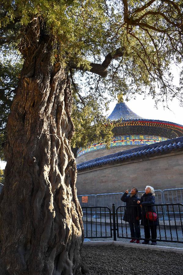 12月19日,游客在观赏北京“最美十大树王”之一的天坛九龙柏。当日,北京市园林绿化局在天坛公园举办“传承古树文化 彰显古都风韵——北京最美十大树王发布仪式”。本次发布的“最美十大树王”包括:密云区新城子镇古侧柏九搂十八杈、海淀区苏家坨镇车耳营村古油松、东城区东花市街道花市枣苑社区酸枣王、西城区北海公园画舫斋古柯亭院内唐槐、门头沟区戒台寺九龙松、门头沟区潭柘寺帝王树、海淀区颐和园邀月门东侧古玉兰、西城区宋庆龄故居中院东侧古西府海棠、东城区天坛公园回音壁外九龙柏、延庆区千家店镇千家店村榆树王(排名不分先后)。北京市园林绿化局希望以本次活动为载体,提升公众保护古树名木的意识。