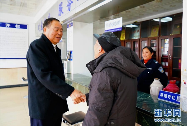12月24日,邱娥国(左)在南昌市筷子巷派出所向一位前来办事的居民问好。 新华社记者 胡晨欢 摄