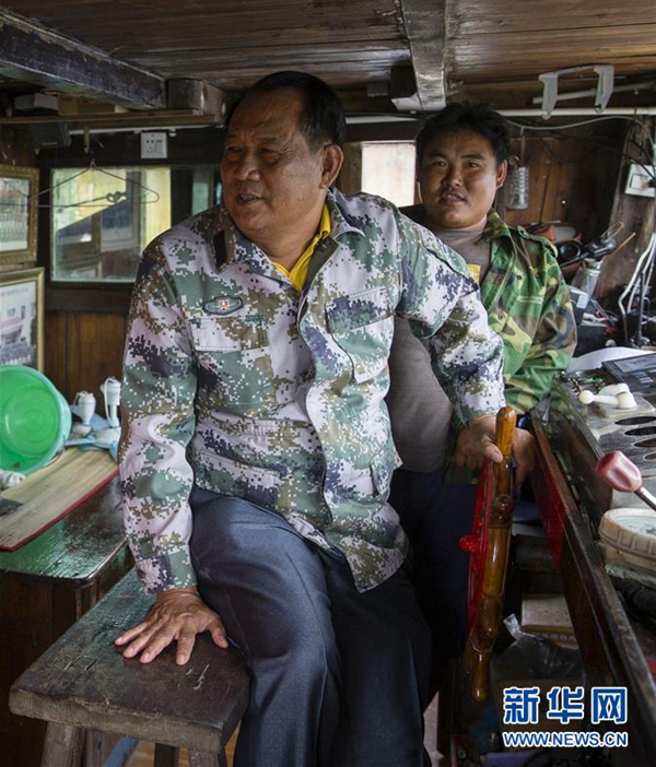 11月14日,在海南省琼海市潭门镇,王书茂(左)在渔船上。 新华社发(宋国强 摄)