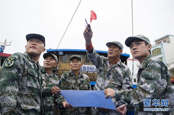 12月10日,在海南省琼海市潭门镇,王书茂(右二)组织民兵开展训练。 新华社发(宋国强 摄)