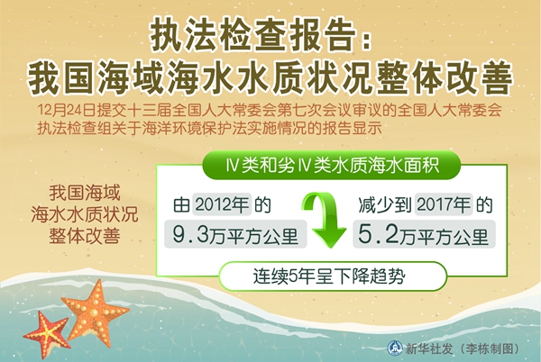 新华社北京12月25日电(记者王茜、滕军伟)24日提交十三届全国人大常委会第七次会议审议的全国人大常委会执法检查组关于海洋环境保护法实施情况的报告显示,我国海域海水水质状况整体改善。