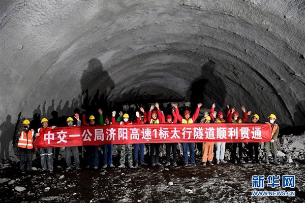 12月26日,中交一公局工程建设者在济阳高速公路穿越太行山隧道群施工现场庆祝隧道贯通。新华社记者 朱祥 摄