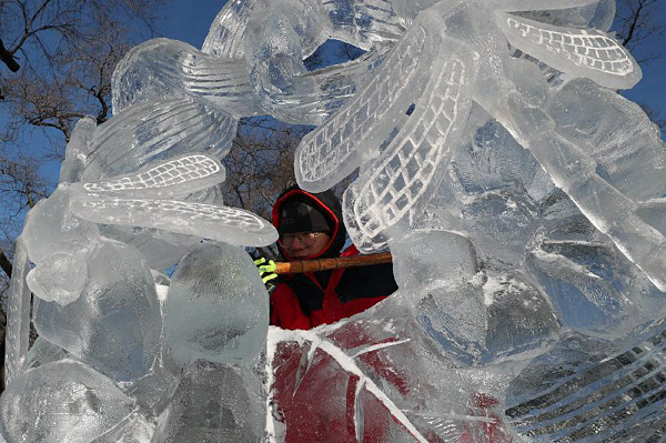 12月27日,选手在比赛中完善冰雕作品。当日,第十六届黑龙江省大学生冰雕艺术设计创作大赛在哈尔滨兆麟公园落下帷幕,全省高校共有99支队伍参赛。