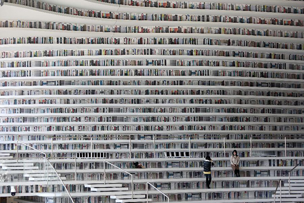 12月27日,读者在天津滨海新区图书馆中庭的“书山”上拍照。滨海新区图书馆位于天津滨海文化中心,2017年10月1日正式开馆,设计立意为“滨海之眼”和“书山有路勤为径”。图书馆现有藏书60多万册,一年多来接待读者约280万人次,已成为滨海新区的文化“新地标”。