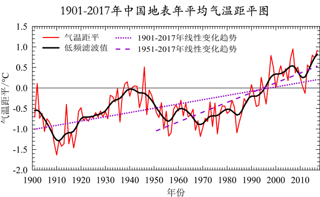 1901-2017年中国地表年平均气温距平图 图片数据来源:国家气候中心