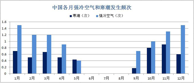 中国各月强冷空气和寒潮发生频次 图片数据来源:国家气候中心