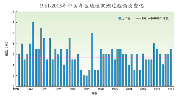 1961-2015年中国年区域性寒潮过程频次变化 图片数据来源:国家气候中心