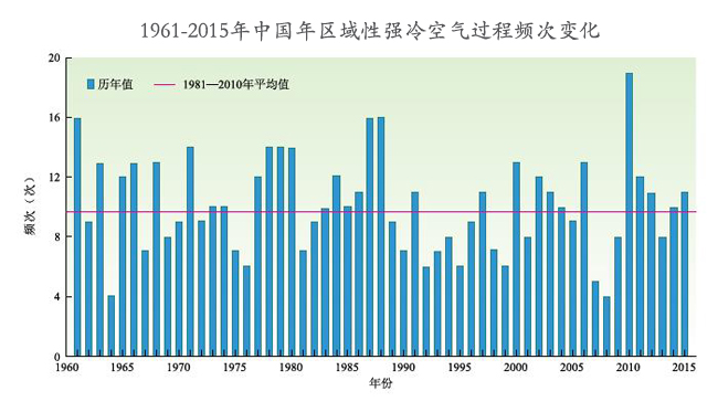 1961-2015年中国年区域性强冷空气过程频次变化 图片数据来源:国家气候中心