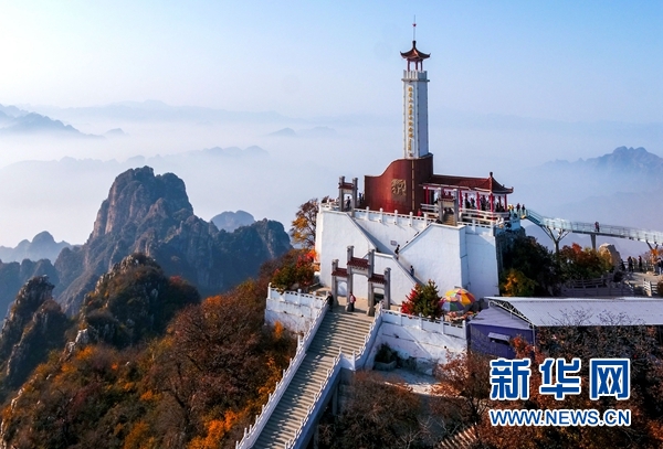 这是狼牙山棋盘陀峰顶的“狼牙山五勇士纪念塔”(2017年10月27日无人机拍摄)。 新华社发