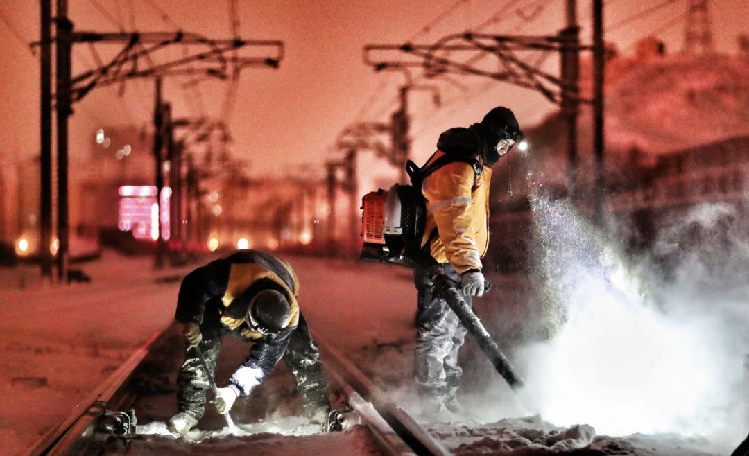 2018-12-05,新疆乌鲁木齐站。大雪后,高铁工务人对高铁线路的道岔进行除冰清雪作业,保障高铁安全运行。作者:摆风亮