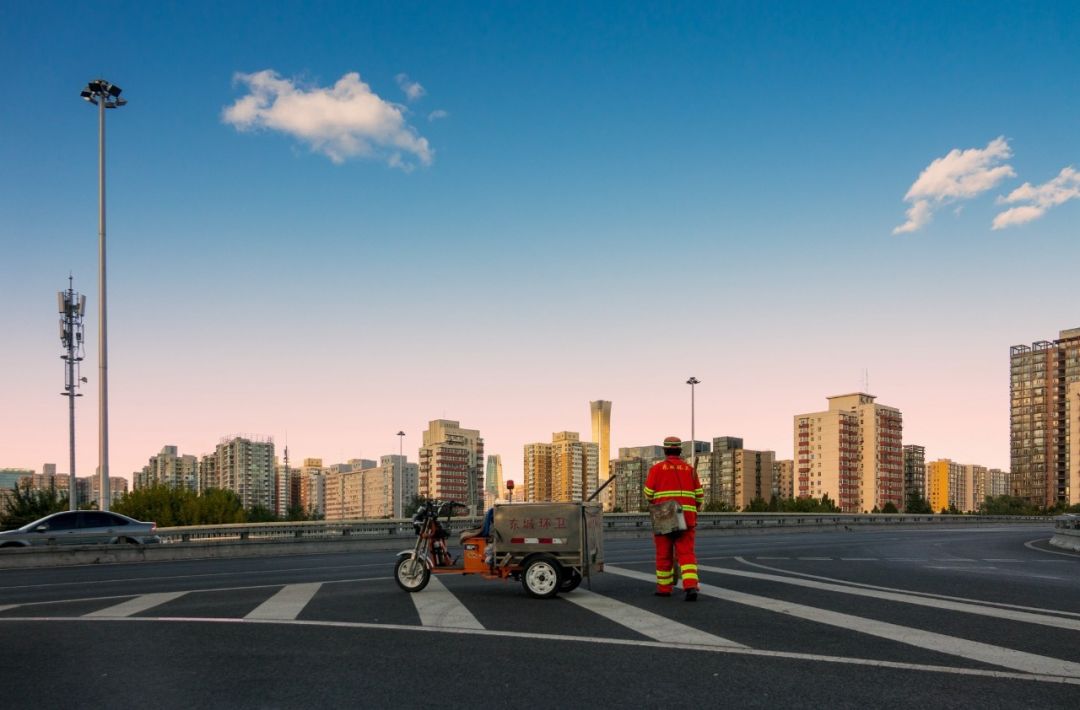 2018-10-09,北京广渠门桥。你是城市美容师,你梳理着大街小巷,你是城市一景,与蓝天相映成辉。作者:月份牌