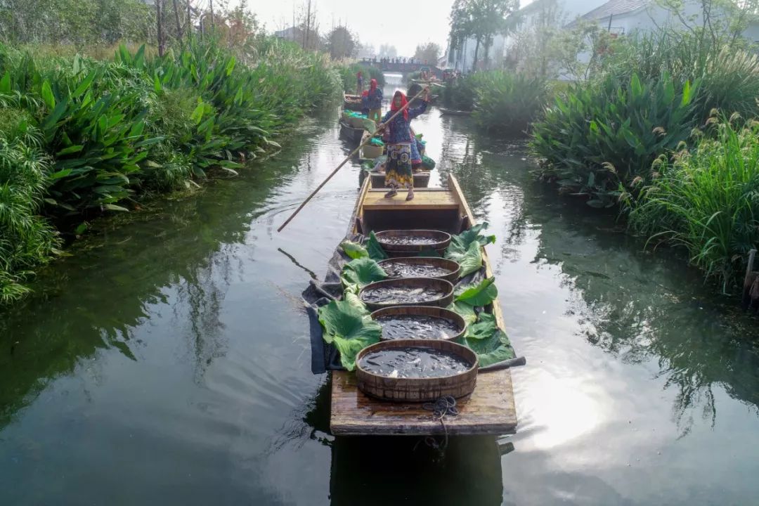 2018-09-23,江苏泰州兴化。在江苏省兴化市东罗村,农民在“水上市集”展示特色农产品。当日是首届中国农民丰收节,全国各地举行丰富多彩的活动庆祝丰收。作者:汤德宏