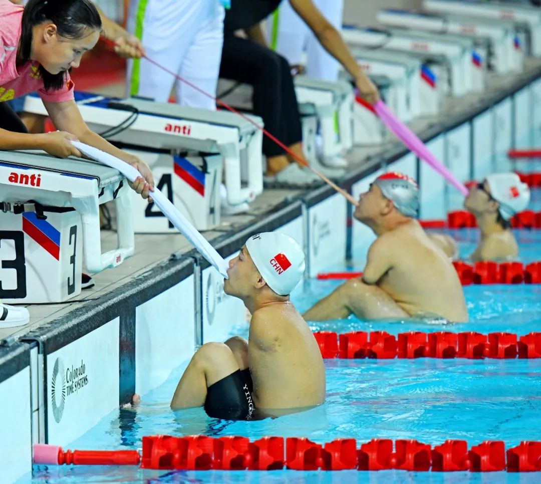 2018-08-28,广东省肇庆市西江学院游泳馆。三名重度残障选手在游泳赛道上准备一拼。当日,广东省第八届残疾人运动会游泳项目举行决赛。作者:文兄言成