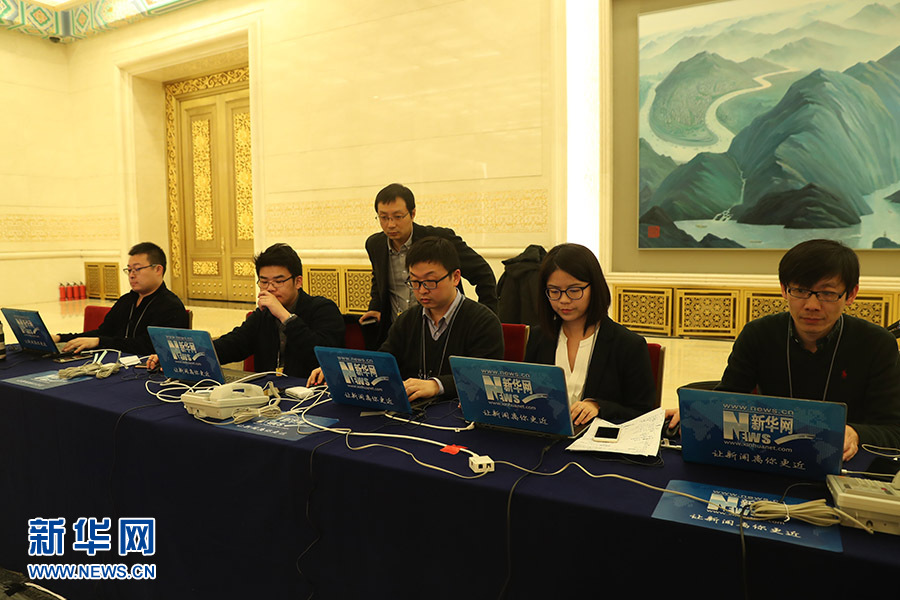 民主党派中央和全国工商联领导人记者会3月6日下午在人民大会堂金色大厅举行,邀请民革中央主席万鄂湘、民盟中央主席丁仲礼、民建中央主席郝明金、民进中央主席蔡达峰、农工党中央主席陈竺、致公党中央主席万钢、九三学社中央主席武维华、台盟中央主席苏辉、全国工商联主席高云龙回答记者提问。图为现场直播团队正在进行准备工作。新华网/中国政府网 陈杰 摄