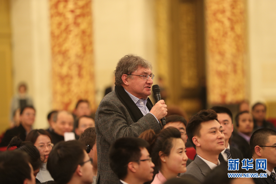 民主党派中央和全国工商联领导人记者会3月6日下午在人民大会堂金色大厅举行,邀请民革中央主席万鄂湘、民盟中央主席丁仲礼、民建中央主席郝明金、民进中央主席蔡达峰、农工党中央主席陈竺、致公党中央主席万钢、九三学社中央主席武维华、台盟中央主席苏辉、全国工商联主席高云龙回答记者提问。图为俄罗斯塔斯社记者提问。新华网/中国政府网 陈杰 摄