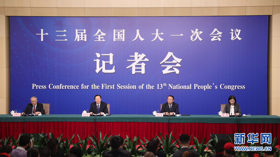 十三届全国人大一次会议新闻中心于3月7日在梅地亚中心多功能厅举行记者会,邀请农业部部长韩长赋,农业部新闻发言人、办公厅主任潘显政就“实施乡村振兴战略 推动农业转型升级”的相关问题回答中外记者的提问。图为记者会现场。新华网/中国政府网 陈杰 摄