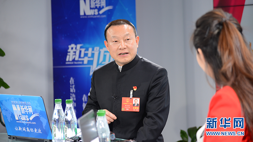 3月7日,全国人大代表、河南省信阳市文新茶叶有限责任公司董事长刘文新(左)做客新华网2018全国两会特别访谈。新华网 杨濛摄