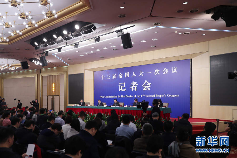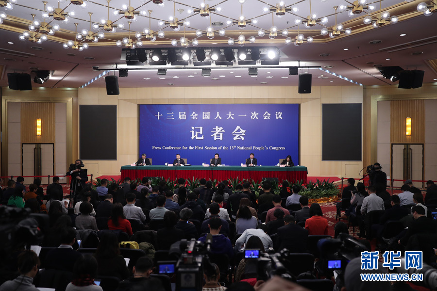 十三届全国人大一次会议新闻中心于3月7日上午在梅地亚中心多功能厅举行记者会,邀请财政部部长肖捷,副部长史耀斌、胡静林就“财税改革和财政工作”相关问题回答中外记者提问。图为记者会现场。新华网/中国政府网 陈杰 摄