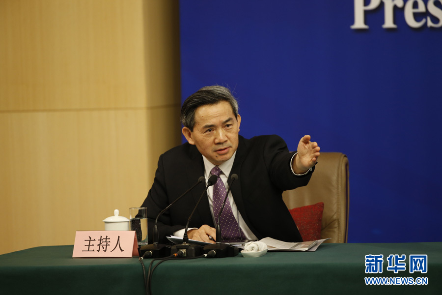 十三届全国人大一次会议新闻中心于3月7日上午在梅地亚中心多功能厅举行记者会,邀请财政部部长肖捷,副部长史耀斌、胡静林就“财税改革和财政工作”相关问题回答中外记者提问。图为记者会主持人何绍仁。新华网/中国政府网 陈杰 摄