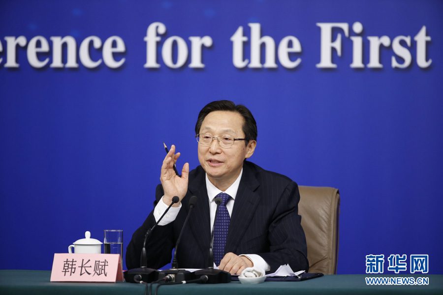 十三届全国人大一次会议新闻中心于3月7日在梅地亚中心多功能厅举行记者会,邀请农业部部长韩长赋,农业部新闻发言人、办公厅主任潘显政就“实施乡村振兴战略 推动农业转型升级”的相关问题回答中外记者的提问。图为韩长赋回答记者提问。新华网/中国政府网翟子赫