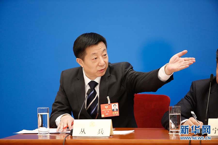 全国政协十三届一次会议3月8日15:00在人民大会堂新闻发布厅举行第二场记者会,邀请中央财经领导小组办公室副主任杨伟民,中国进出口银行董事长、党委书记胡晓炼,农业部原副部长陈晓华,全国工商联副主席、清华大学经济管理学院院长钱颖一,中国中化集团有限公司党组书记、董事长宁高宁就推动经济高质量发展回答记者提问。图为记者会主持人丛兵 。新华网/中国政府网 翟子赫摄