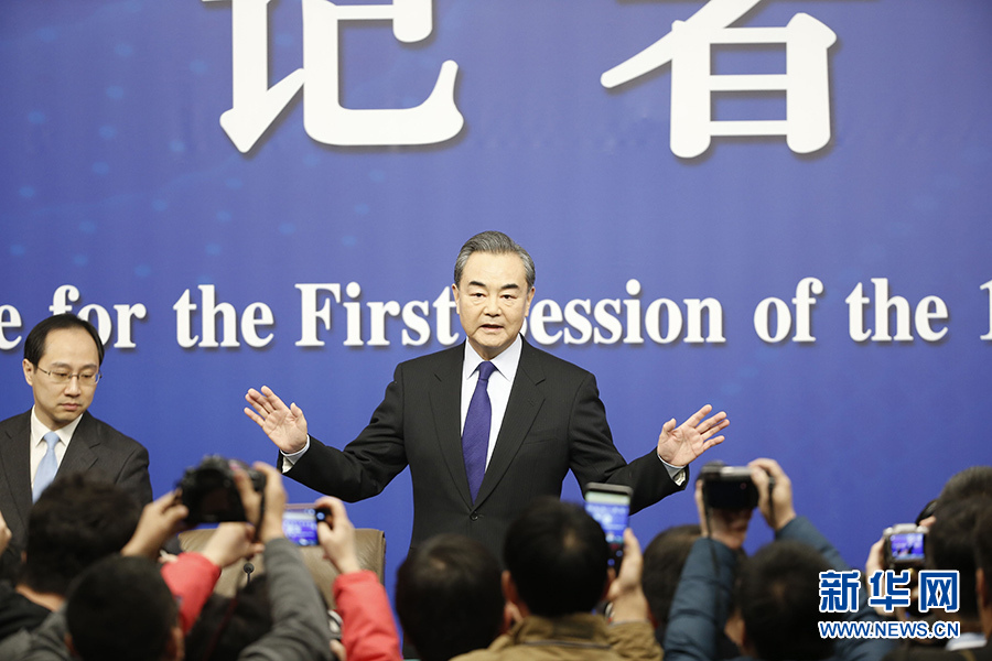 十三届全国人大一次会议新闻中心于3月8日上午10时在梅地亚中心多功能厅举行记者会,邀请外交部部长王毅就“中国外交政策和对外关系”回答中外记者提问。图为王毅向记者示意。新华网/中国政府网陈杰 摄