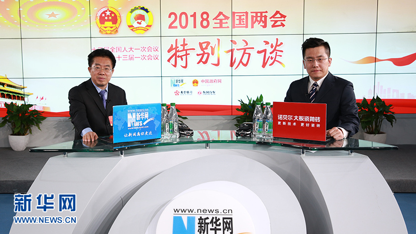 全国人大代表、中国人民银行郑州中心支行行长徐诺金(左)做客新华网2018全国两会特别访谈。新华网杨锘摄