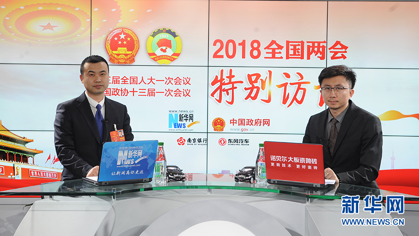 3月9日,全国人大代表、辽宁三沟酒业有限责任公司董事长吴京耕(左)做客新华网2018全国两会特别访谈。新华网 郭小天摄