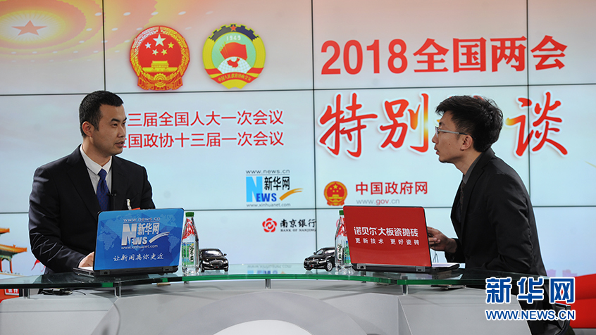 3月9日,全国人大代表、辽宁三沟酒业有限责任公司董事长吴京耕(左)做客新华网2018全国两会特别访谈。新华网 郭小天摄