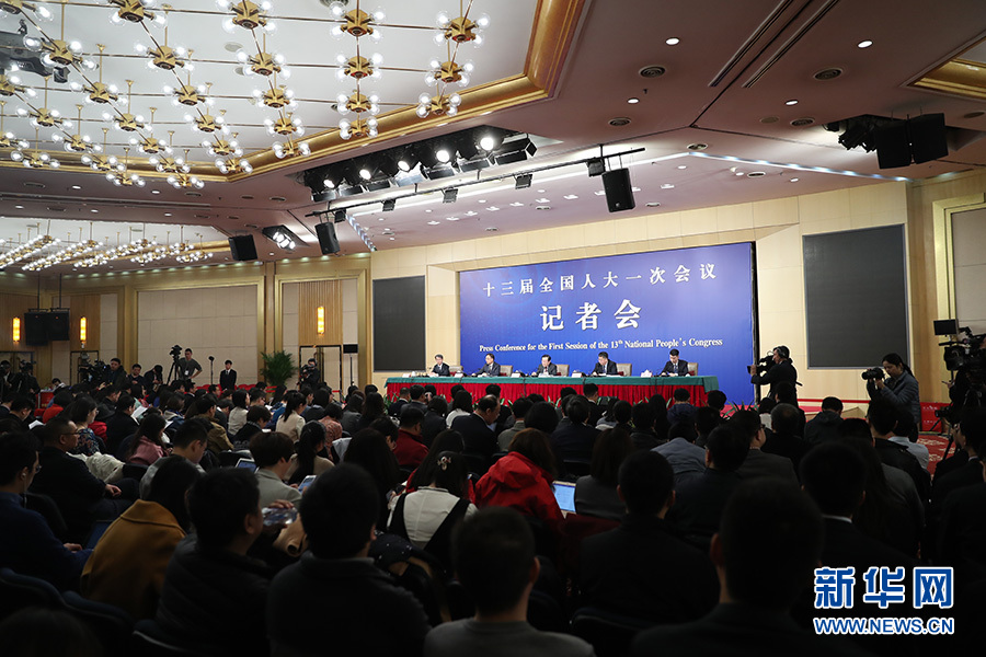 十三届全国人大一次会议新闻中心3月10日上午10时45分在梅地亚中心多功能厅举行记者会,邀请科技部部长万钢、政策法规与监督司司长贺德方、创新发展司司长许倞就“加快建设创新型国家”相关问题回答中外记者提问。图为记者会现场。 新华网/中国政府网 陈杰 摄