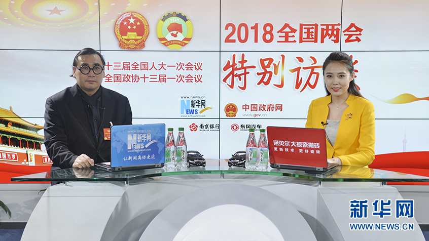 3月10日,全国政协委员、中国艺术研究院研究生院常务副院长刘万鸣(左)做客新华网2018全国两会特别访谈。新华网 李相博摄