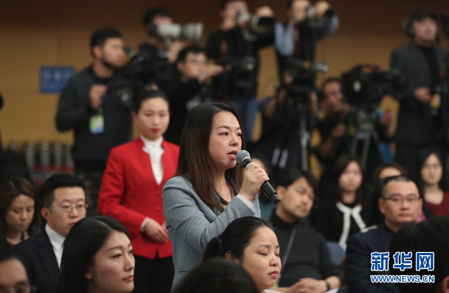 十三届全国人大一次会议新闻中心3月10日15时在梅地亚中心多功能厅举行记者会,邀请国务院国资委主任肖亚庆,副秘书长、新闻发言人彭华岗就“国有企业改革发展”相关问题回答中外记者提问。图为财新周刊记者提问。新华网/中国政府网 曲植 摄
