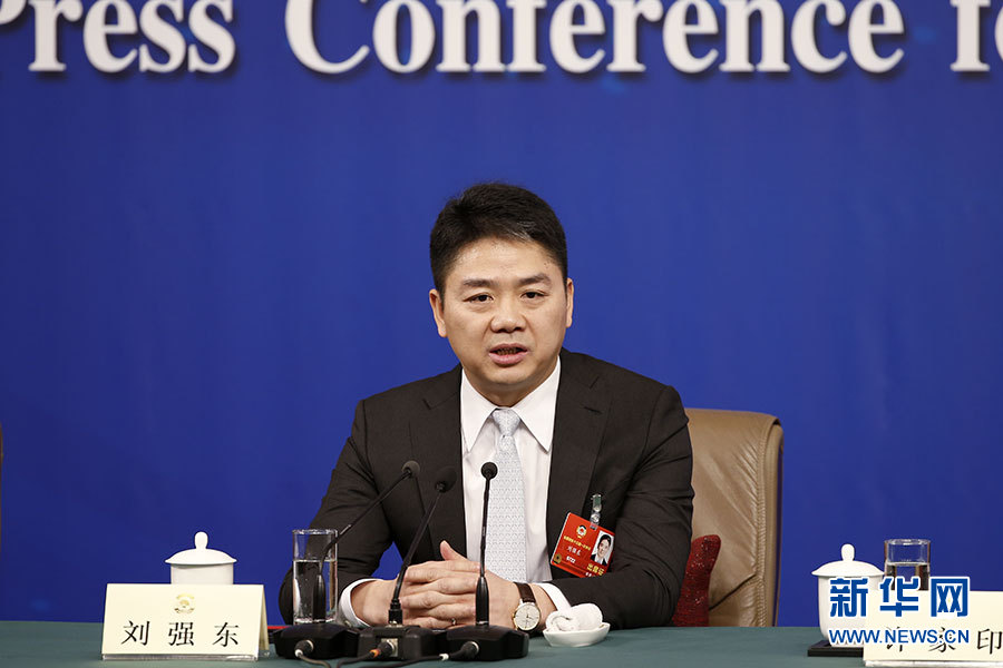 3月10日8时45分,全国政协十三届一次会议在梅地亚中心多功能厅举行记者会,邀请5位全国政协委员就“提高保障和改善民生水平”回答记者提问。图为刘强东委员回答记者提问。新华网/中国政府网 陈杰 摄